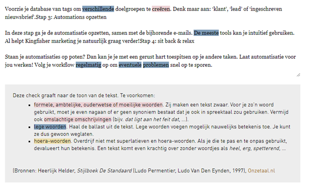 Last but certainly not least is er de online schrijfassistent van De Standaard. Kleine disclaimer: de tool wordt niet meer regelmatig geüpdatet. Maar hij blijft heel handig. Je kan teksten invoegen en verschillende checks uitvoeren. Van een algemene spellingcheck tot specifiek dt-fouten. Maar wat het écht interessant maakt, zijn de stijlchecks. Scan je tekst op herhalingen, passieve woorden, toon of de naamwoordstijl. Superhandig en efficiënt.
